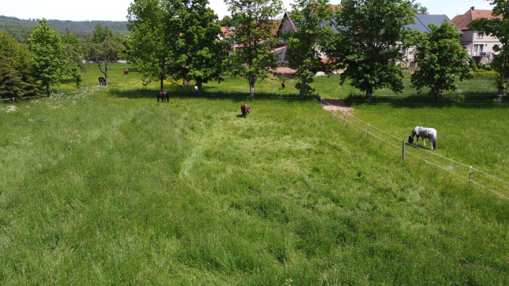 Das Schloss bildet mit der Kirche, dem Pferdestall und den Wirtschaftsgebäuden einen echten Gutshof, den Sie über die schmucke Hofeinfahrt betreten. Direkt hinter dem Hof schließen sich die Pferdekoppeln, der Reitplatz, der Dorfweiher und die Ackerflächen an.